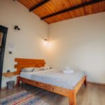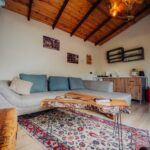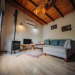 İç mekânda yüksek ahşap tavanlar, konforlu oturma alanı ve şömine detayı sıcak bir ortam yaratırken; modern mutfak bölümü günlük ihtiyaçlarınızı rahatlıkla karşılayacak şekilde donatılmıştır. Yatak odası sade ve ferah yapısıyla dinlendirici bir uyku alanı sunar.