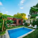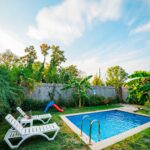 Bungalovun dış alanında yer alan özel yüzme havuzu, şezlonglar ve bahçe oturma gruplarıyla çevrilidir. Gün boyunca güneşin tadını çıkarabilir, serin sularla ferahlayabilir ve doğa içerisinde dinlendirici anlar yaşayabilirsiniz. Bahçede bulunan tropikal bitkiler ve yeşil alan, size şehirden uzak bir tatil hissi sunar.